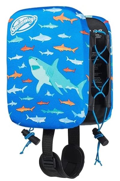 Then I found this amazing floatie on the left by Swimways. (Google Power Swimr) The front and the back sections are filled with "slices" of foam. You can add or remove slices to define how she would be floating. The side bungy cords tighten or expand. And the crotch strap stops it from pulling up to her neck.